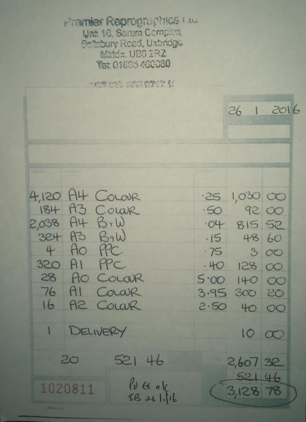 And here is the invoice! Please note we actually had "20,388" A4 B&W pages printed - not "2038". The person who made out the bill left off the second eight!