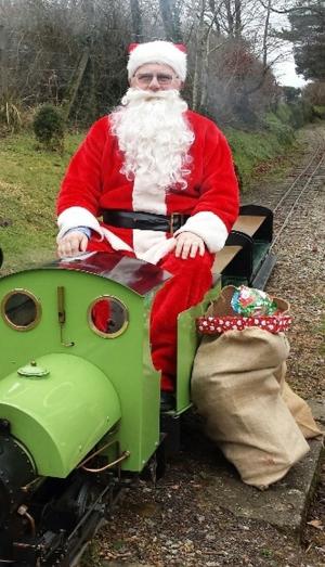 Santa arriving by special train at Woody Bay, where his elves help unload the sacks of presents