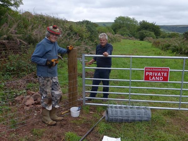 9. Some distance away, Anne and Keith were busy installing new fencing at Parracombe Lane, where the bridge goes over the old trackbed. The grassy area defines the trackbed which should be about 15ft lower to allow the track to go under the lane. The cutting has been filled in over the years and your photographer is standing on the bridge itself. This cutting will be excavated and the bridge reinstated as part of our extension.