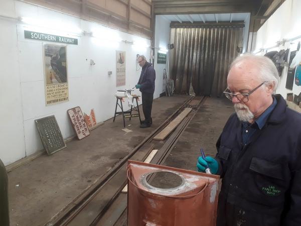 4. In the paint shop, Jim Pounds and Geoff Long are busy renovating some small projects such as a lamp and cast iron railway signs.