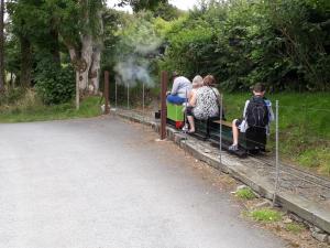13. Dave Evans continues repairs to the picnic tables on the upper lawn whilst locomotive LITTLE OLLIE with the miniature train waits beyond.