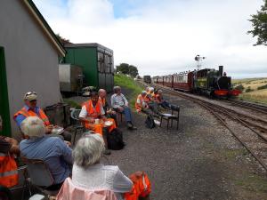 7. & 8. Lunch for the Thursday gang is outside the mess room observing the train passing again.