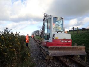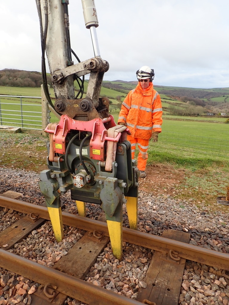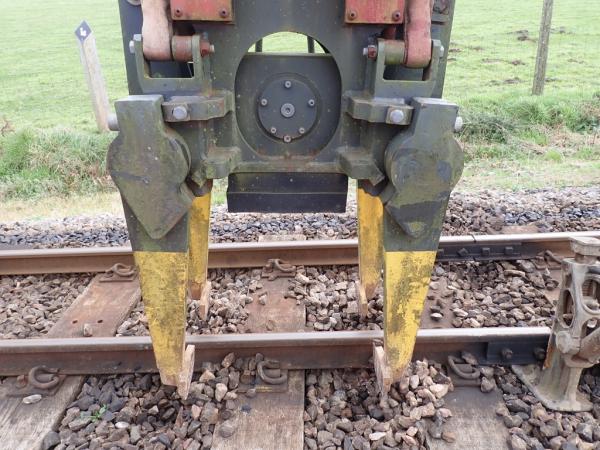 2. As described in our report of 16 November "jacking and packing" involves rectifying dropped track joints. Previously done manually, as this was hard and slow work, General Manager Martyn decided to use a tamping attachment on the mini-excavator to see if the work could be done quicker. As can be seen the tamping attachment has four hydraulically operated, spade ended, prongs.