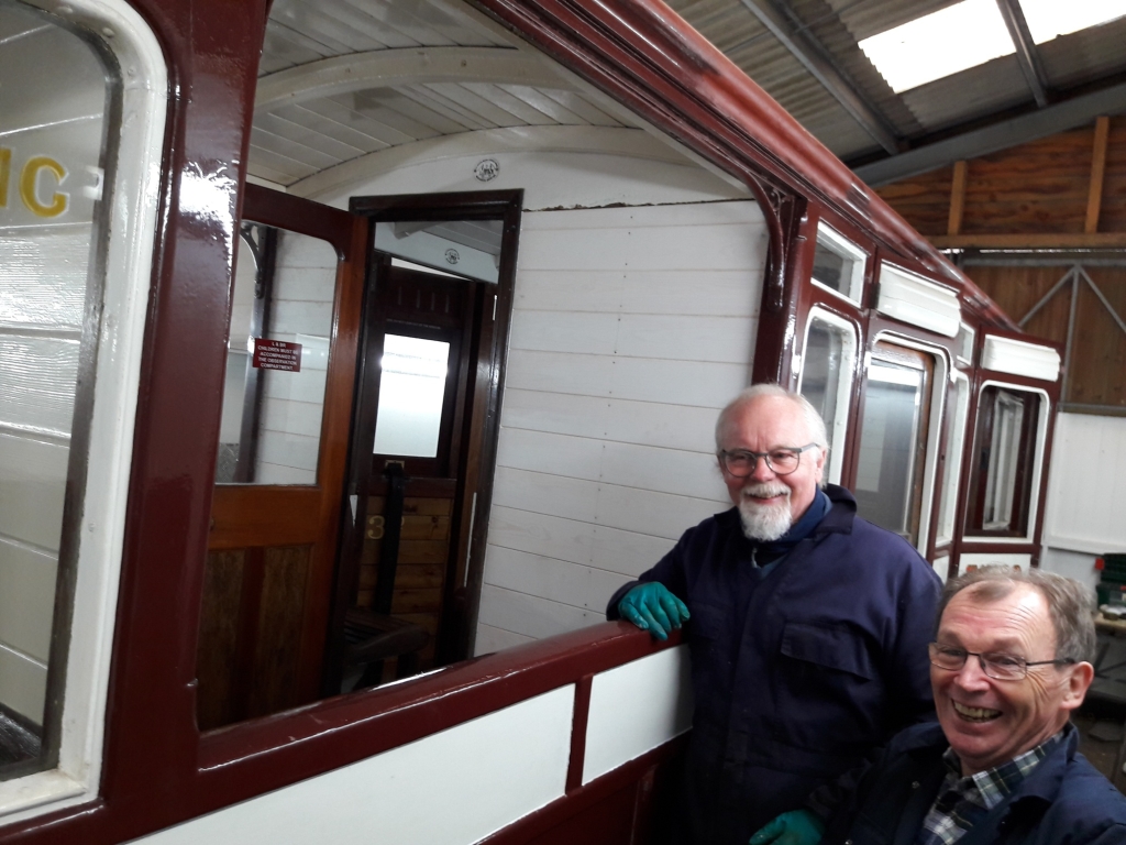 15. Progress on Carriage No. 7. Charles Summers and David Ely of the EAST group came down to Devon last weekend to fit replacement panels inside the observation compartment. A smiling Jim Pounds and Barrie Cann check out the new panels which will now have several coats of paint. The panels Charles and David replaced were the original ones fitted the vehicle back in 1897.