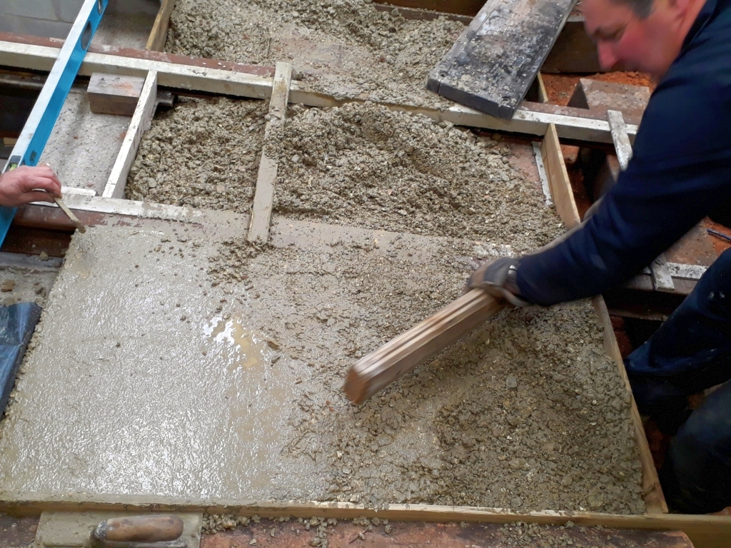 11. Commencing concreting at the door end - Dave Peach has a go at shovelling aggregate into the mixer.