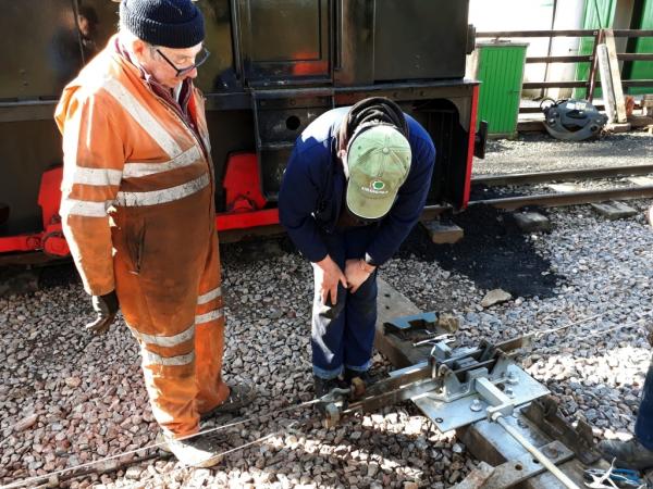 5. The signalling team were making the final adjustments to the detector mechanism for the new down platform up starter signal as AXE runs-round.