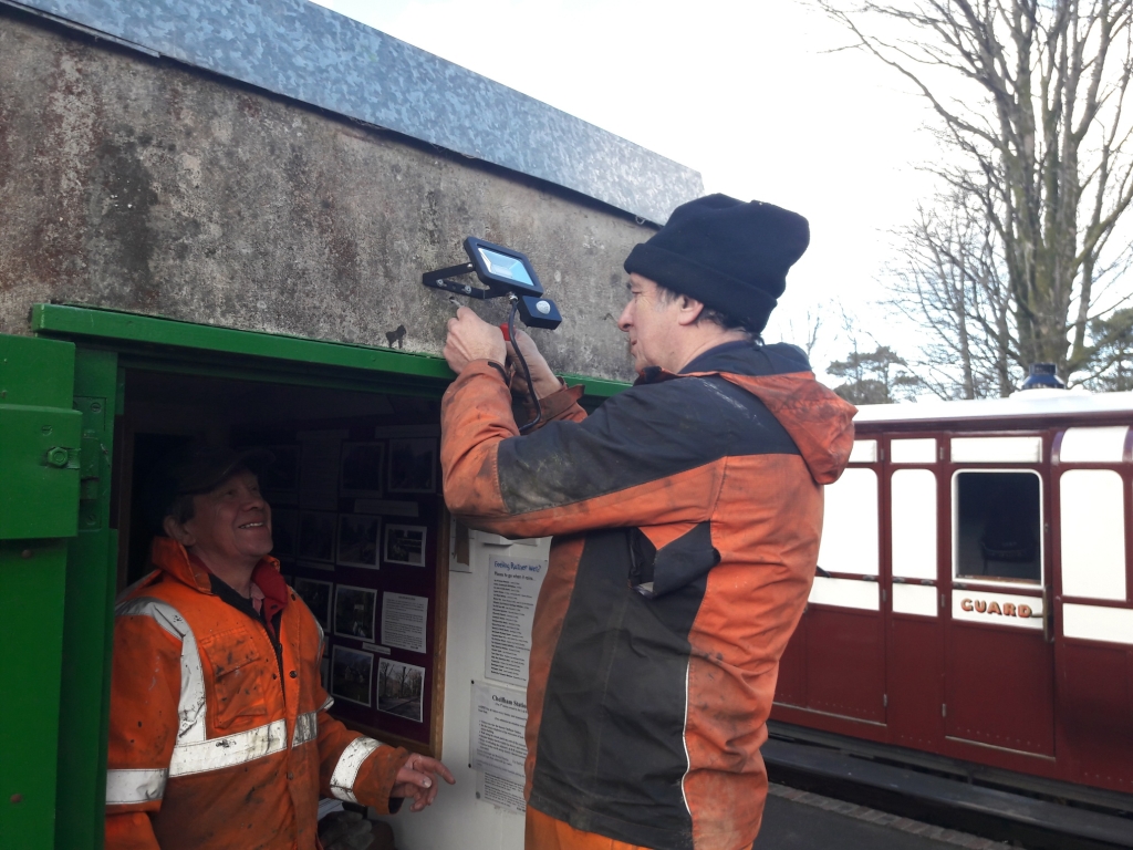 13. Tuesday's great news from Exmoor National Park was well received by everyone at Woody Bay. Guard Bob Ayres and Dave Drayson re-check the extension plans route map of the proposed reinstatement on display on the side of the stable on the up platform.
