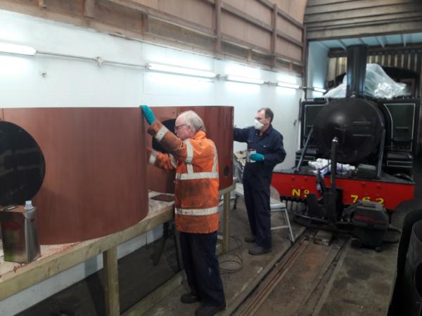 8. Paint shop boys Jim and Barrie painting more red oxide primer onto these sections of ISAAC's boiler cladding.