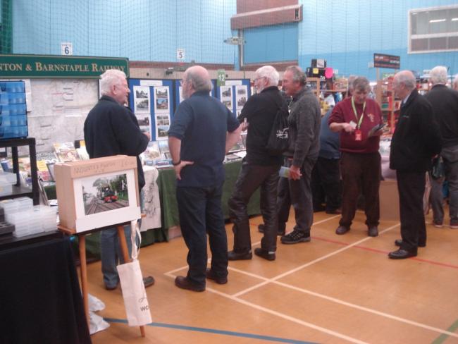 Above John Jones (2nd from left), Roger Beazer (4th from left) and Alan Pearce (5th from left) all busily talking with visitors to the stand. Front left we see one of James Bloomfield's excellent mounted photos of LYD at Woody Bay. The black and white prints were particularly admired. We sold several and thanks to James's generosity every penny geos towards extending the railway. These prints are also available from the shop at Woody Bay as well as from other Area Groups.