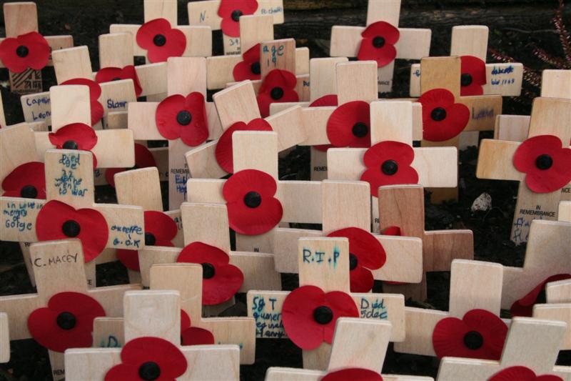 The Poppy Crosses laid by the children. Each bears the name of a family member or a name from a local War Memorial Roll of Honour. All are names of local men and women who gave their life in defence of their Country.