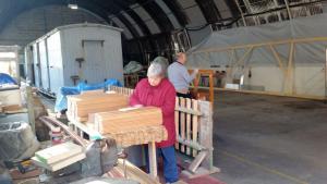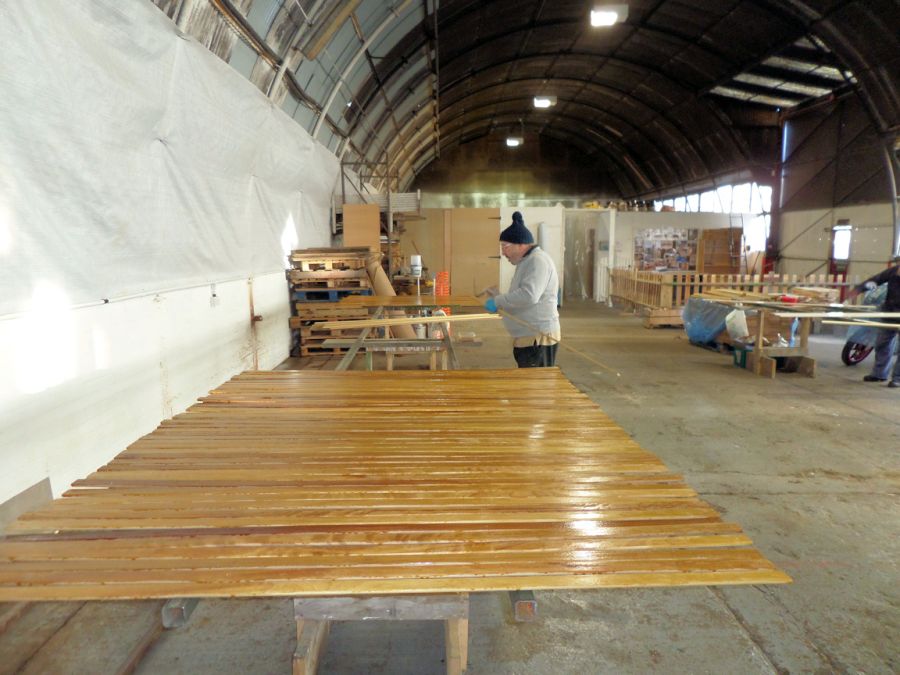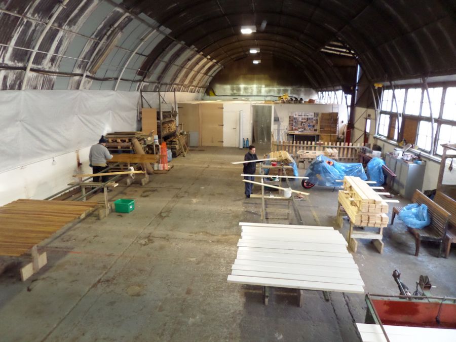 Half-way there! Still the rest of that stack to go. Alan continues painting whilst Norman Willsher assembles seat frameworks and Julia prepares battens for the drying planks .