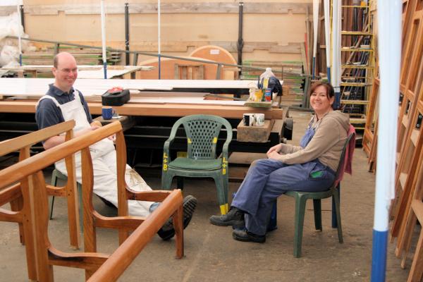 David Horsfall completes the varnishing of the seats assembled by Norman yesterday.