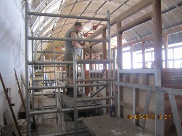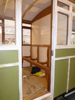 3. Beginning to install the roof boards. The conduit for the electric lighting is visible running down the centre line. Also note the fixed panelled wall of the "smoking compartment" as well as the repaired/restored section of external framing on the left.