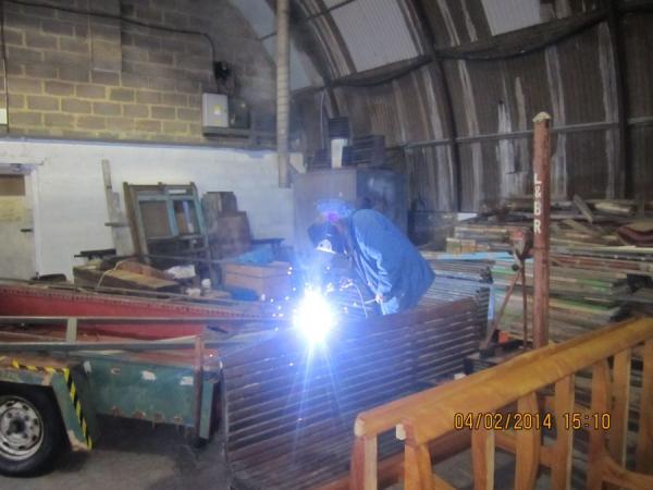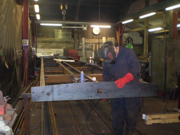 3. Bob Self welding sections of square tube ready for the arrival of coach 11's underframe. Third class seats in the foreground.