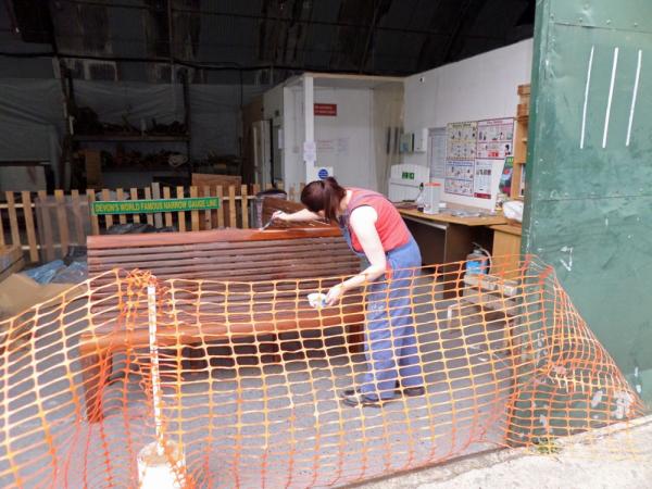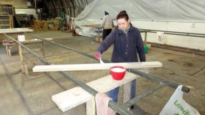 As Sheila continues rubbing down the previously primed timber in the foreground Alan and Pete continue undercoating. The painted planks are then laid out on the underframe to dry.