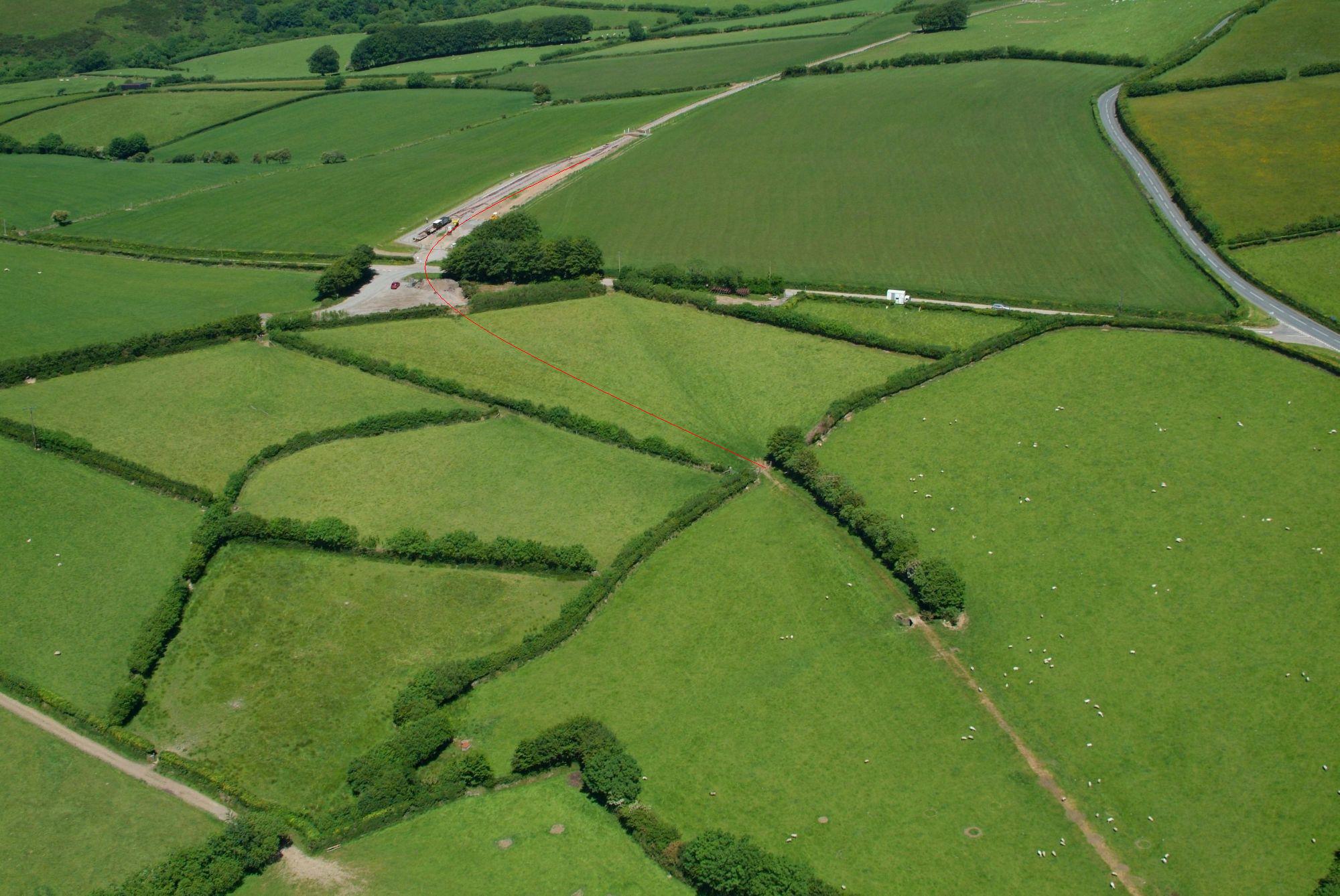 Aerial View of Killington Lane and Beacon Down Quarry © L&BRT Philip Lane. The red line indicates the approximate track alignment.