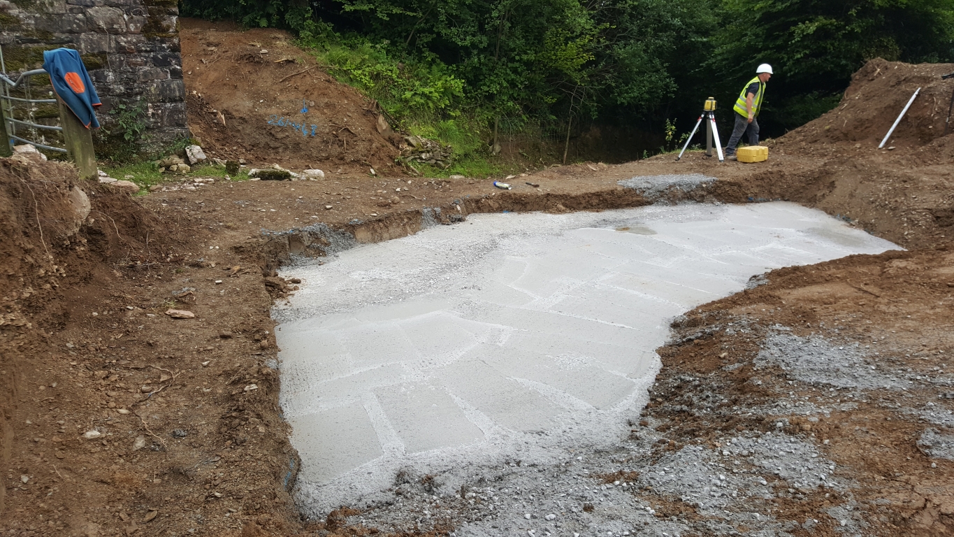 2. On the Lynton side the weak remnant stonework has been removed and a new concrete foundation pad cast ready for setting out and construction of the new abutment and wing walls.