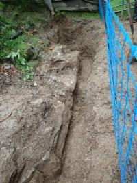 4. 5. & 6. Not too far down, the line of the stonework emerges from the soil, the corners and face of the angled abutment are clearly discernable.