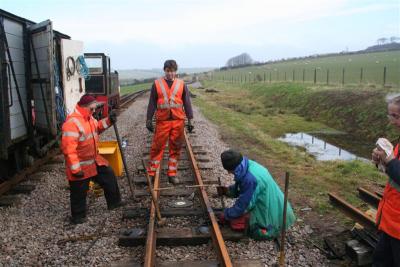 Despite the absence of General Manager Martyn Budd today, the keen enthusiastic volunteers of the Thursday Group were prepared to work outside in the rain to further progress the rail renewal of the loop line at Killington Lane.