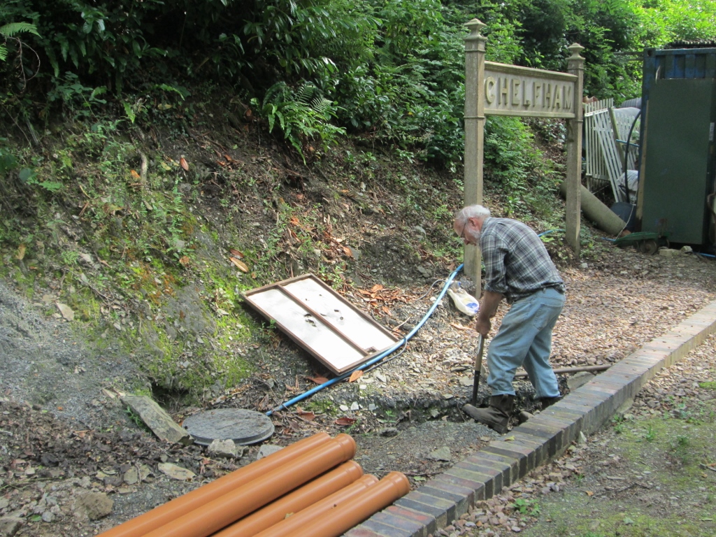 3. An ongoing project this summer is the replacement underground water supply from the newly sunk borehole. Local volunteer Graham Lee digs out the trench on the up platform, near the bore hole.