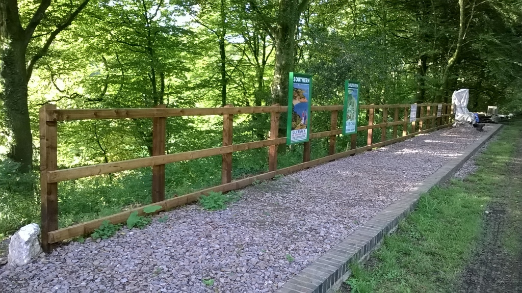 8. & 9. A few months later, Dave fabricated Southern Railway style wooden poster boards. Now erected in their original positions along the fence and with heritage posters advertising ‘Guernsey’ and ‘Bexhill-on-Sea’ as holiday destinations.