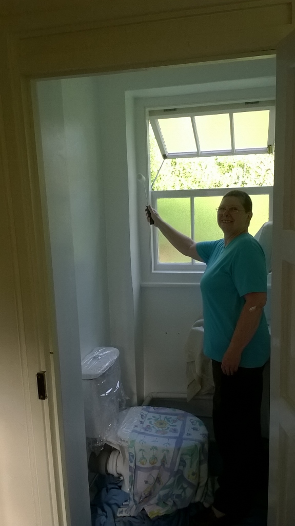 12. Finally, more interior decoration as Lynda Swallow paints the porch area toilet room, (also assisted by husband, David), September 2016.