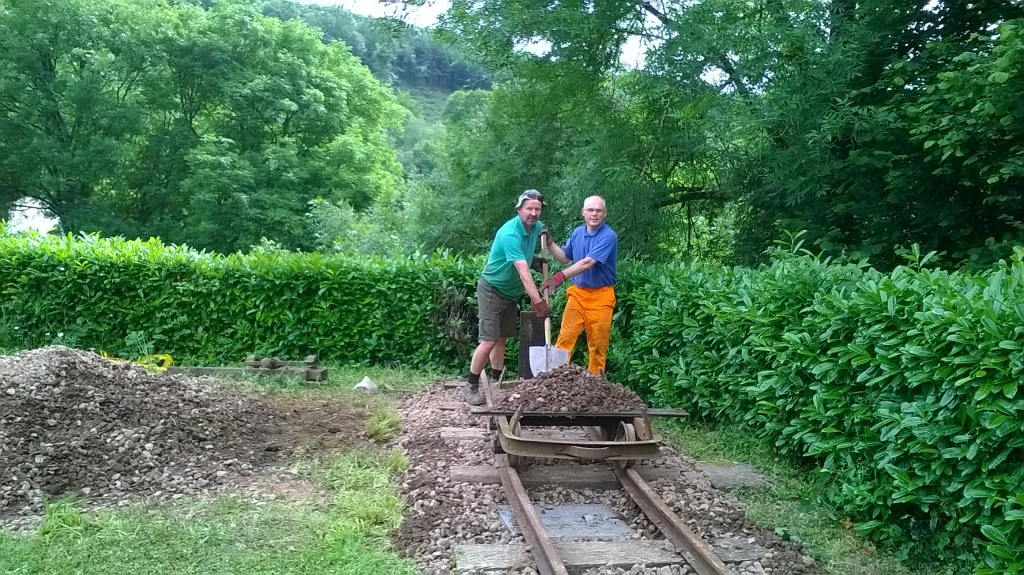 13. Back in July, the down platform siding needed adjustment and ballasting. Ian James from Hampshire (right) assisted Nigel with this work.