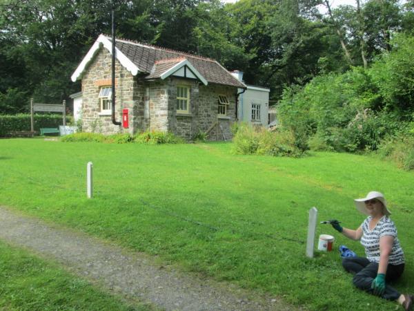 1. New volunteer Lynda Swallow from Exeter gloss paints the new white posts protecting the lawn by the station approach drive.