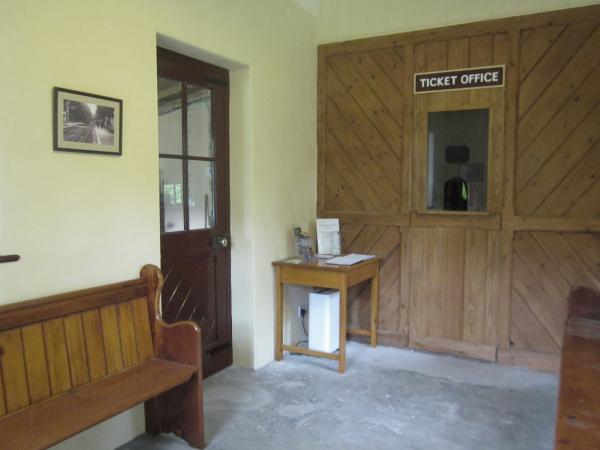 11. The restored wooden partition, ticket office window and visitors book etc. on the table inside the waiting room.