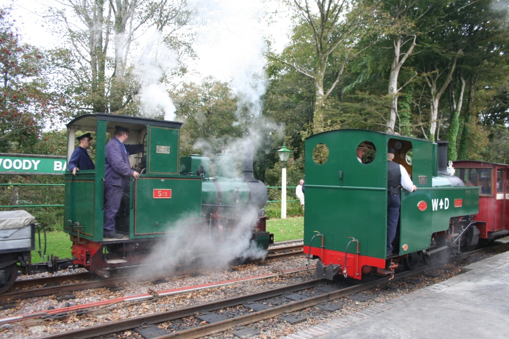 4. Sid steaming into Woody Bay with a goods train as Axe waits to depart with another packed passenger train at the Autumn Gala.