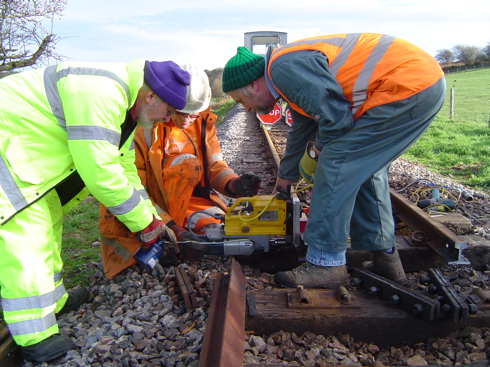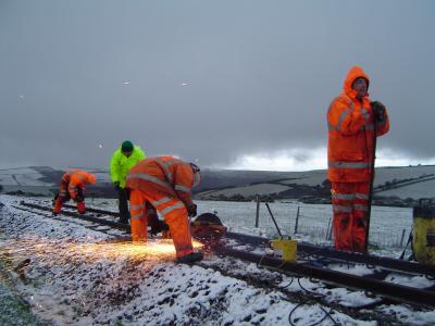 Clear skies on Sunday gave a cold start, but the sunshine kept the workers warm, thanks to a very light breeze. The finishing jobs for the day involved cutting and drilling the last two rails, just below Bridge 67, followed by drilling and plating  a few new sleepers which had already been put in place beneath the new rails.