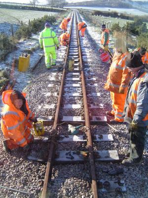 A big turn-out of volunteers on Saturday led to a very successful day, despite the cold weather. All of the new rails were laid in place, clipped down and bolted together.