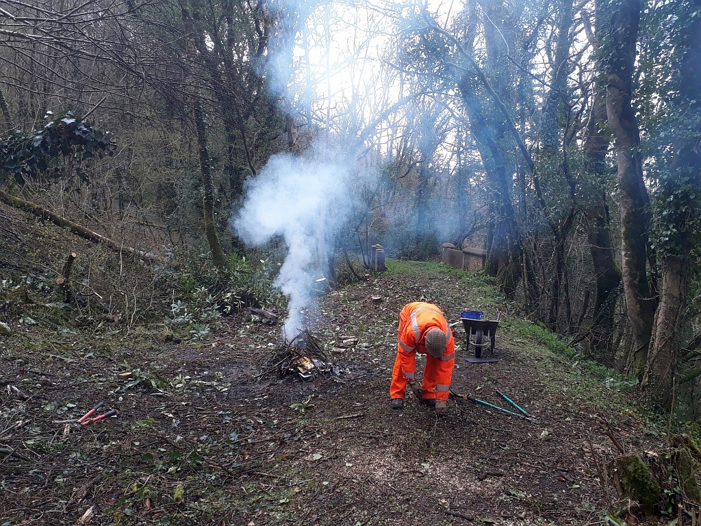 2. Visiting volunteer Ian James helps to feed the bonfire after clearing much of the scrub at this location.
