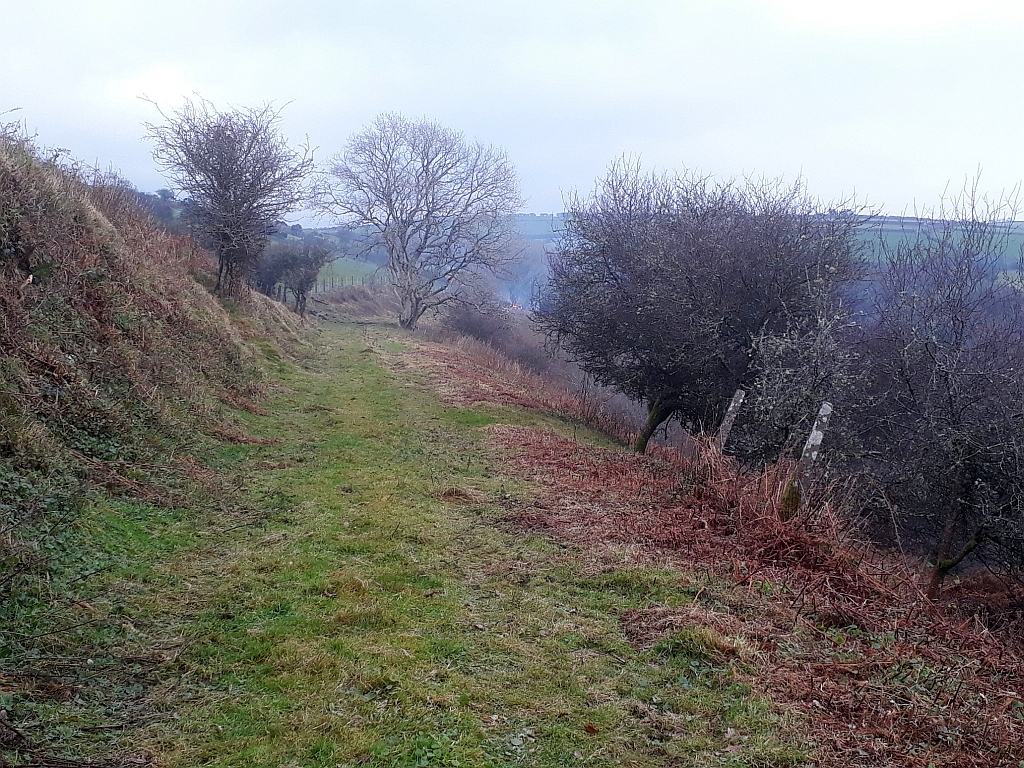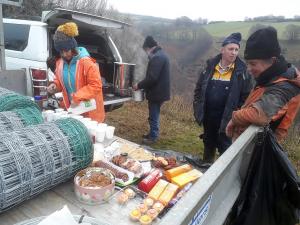 The above selection of photos shows the fencing underway with some replaced and new concrete strainer-posts, the completed work, views along the trackbed, bonfires to clear the gorse scrub cleared, and all the volunteers enjoying their tea and lunch breaks supplied by our mobile generator and tea urn with Tracey and Graham keeping everyone well catered for today.