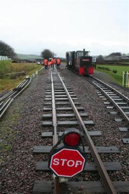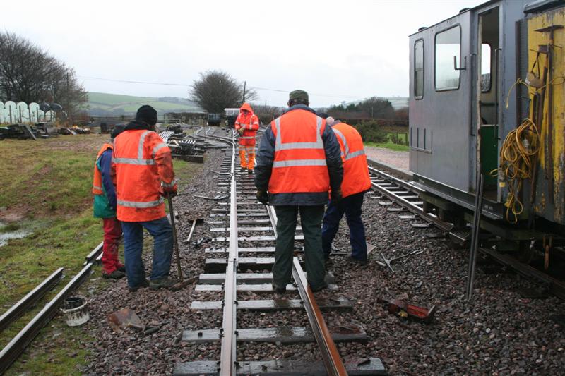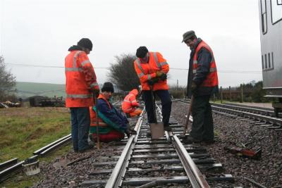 1. With the works train parked alongside, the gang continue the rerailing along the loop line at Killington Lane.