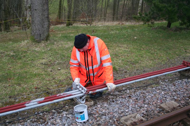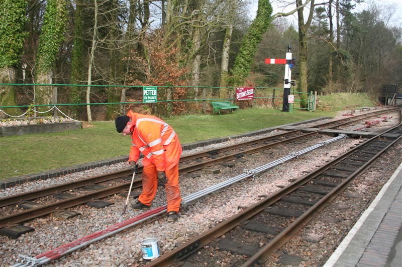 12. Dick paints the point rodding between the platforms. The signalling installation project at Woody Bay recently won a National Railway Heritage Award and Dick is keen to see that the point rodding is in top condition when the Award plaque is unveiled during the 14th-15th May Special Event Weekend.