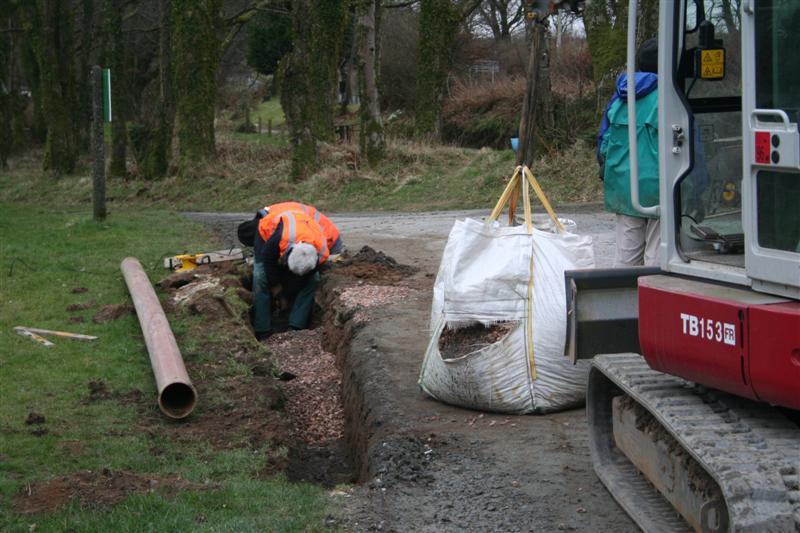 3. The digger delivers a bag of chippings to surround the drainage pipe about to be installed in the ground.