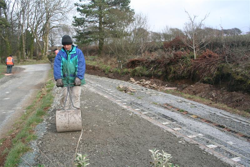 10. An Exmoor National Park planning condition required the replacement of the paving stones on the miniature railway platform with limestone scalpings. Dave Drayson rolls in the stone along the platform.