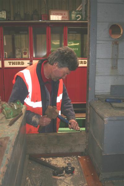 13. Further progress on the MOD Brake Van in the shed as John O'Dell works on some replacement wood panelling.