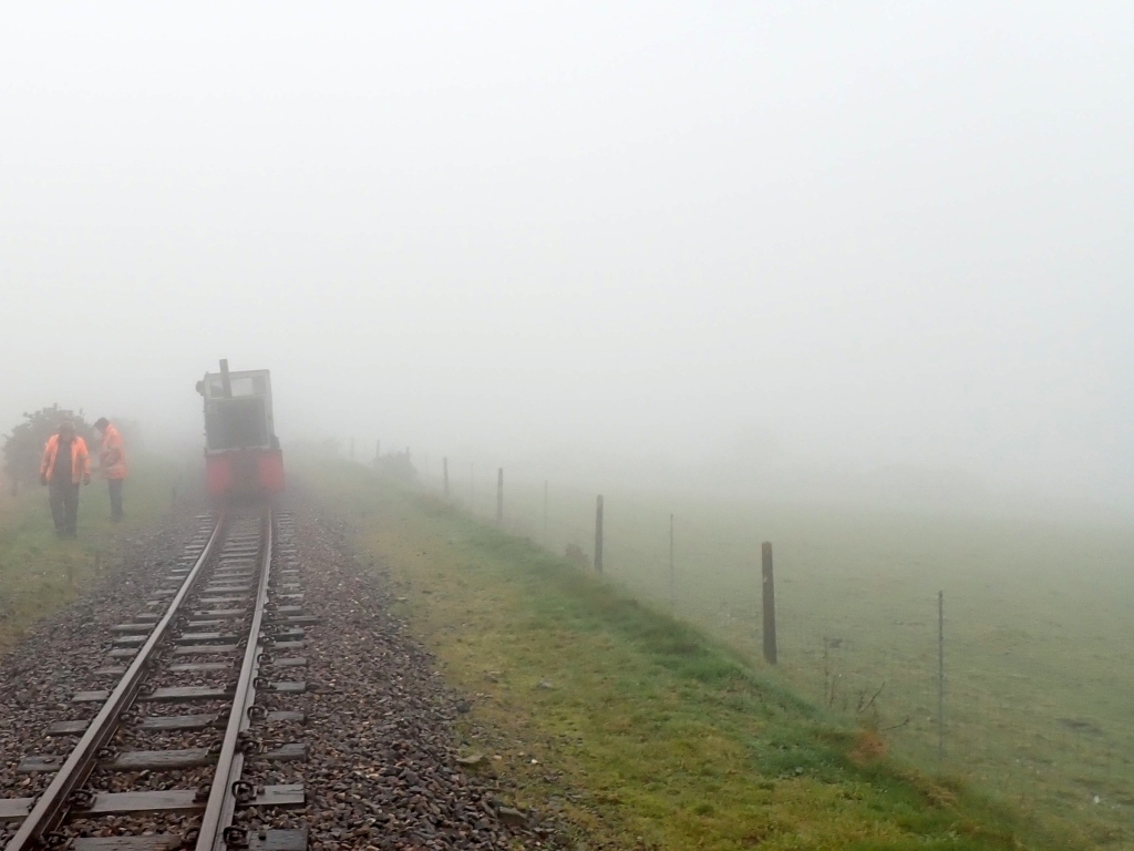 The main gang started their sleeper replacement programme along the line today in good weather. However after lunch, the clouds thickened and the mist descended - visibility at 1000 feet up on Exmoor became limited.