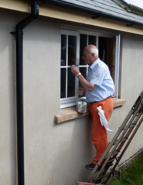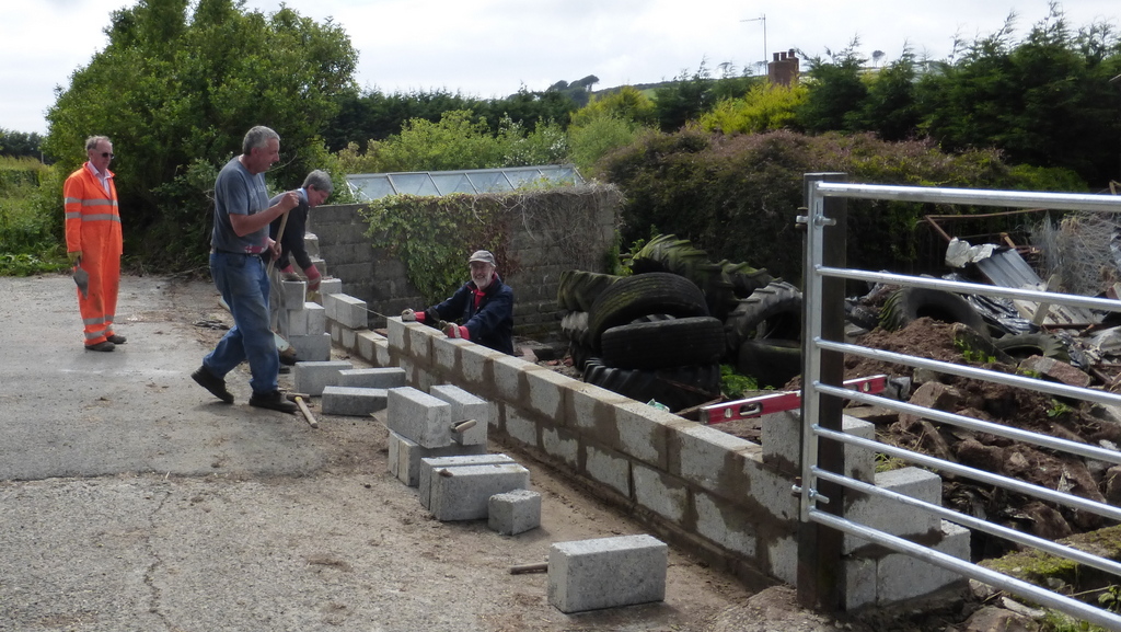 6. A major task today was at Rowley Moor Farm was the reconstruction of a concrete block wall at the entrance that had been partially demolished - probably by a vehicle - prior to purchase. After preparation work involving chisel, hammers and muscle, the new wall began to take shape. Here, Dave (block-cutter extraordinaire), Julian (pointer manifique), Martin (block-layer par excellence) and of course Martyn (broom operator sans pareil) completed the day's work - not bad for a wall built by a committee!.