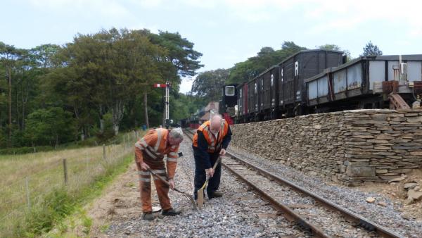 9. Back at Woody Bay, Don and Dick repaired a broken electrical cable feeding the siding stop block light. This involved uncovering the cable, removing the damaged section and joining in a new length with a special weatherproof junction box. Notice the retaining wall beside them.
