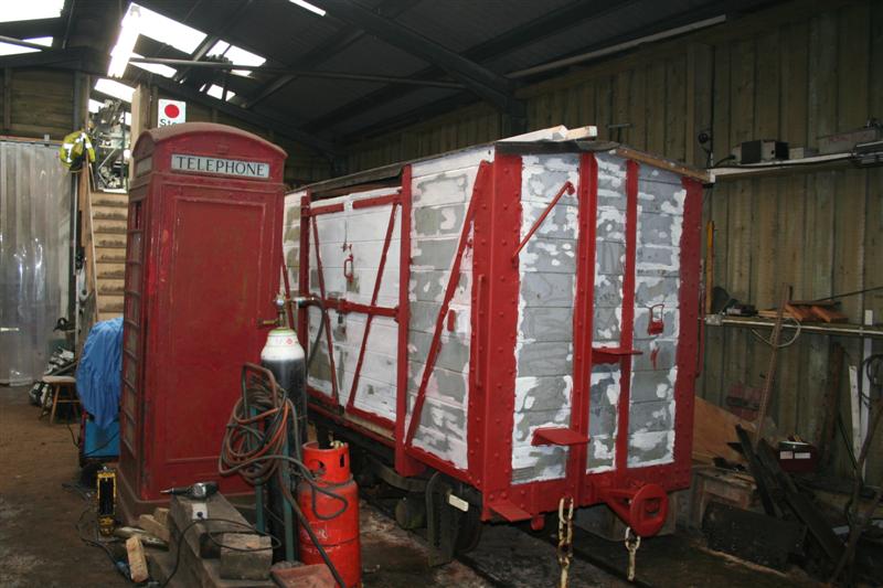 3. After lunch the volunteers worked inside the shed continuing repairs and repaint for Box Van No.62 and some stripping of the old paintwork of the telephone box.
