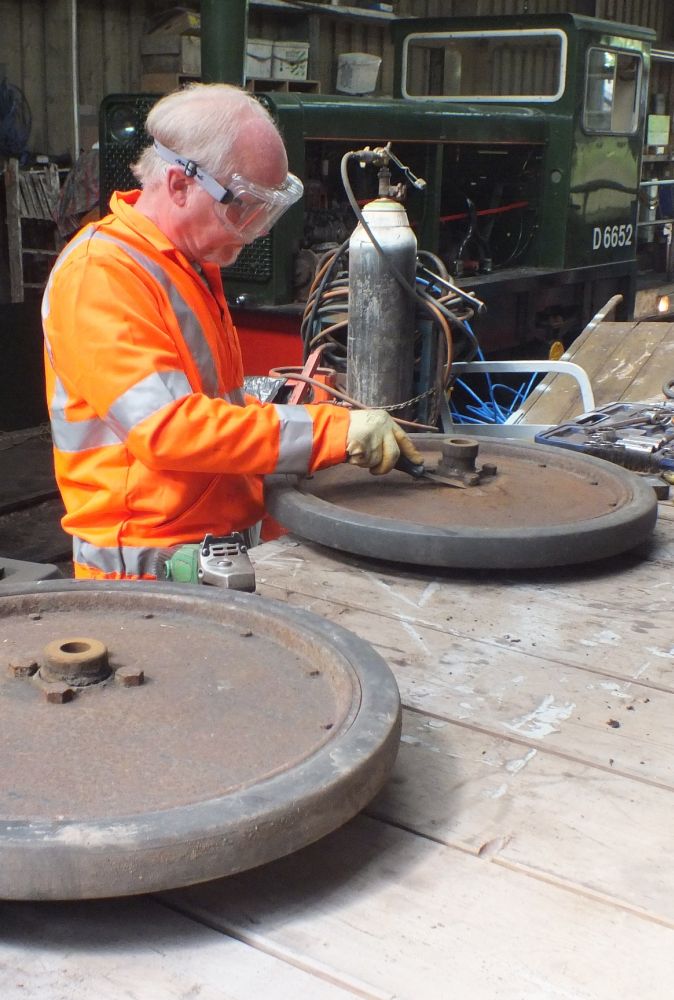 7. Still in the shed, Jim Pounds scrapes a platform barrow wheel to prepare it for priming.