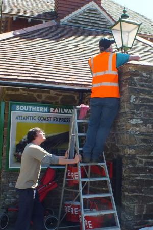 10. The station lamps and painted surfaces, where soot and dust had accumulated, were washed down. Nick Slade steadies the steps for Graham Bendell.