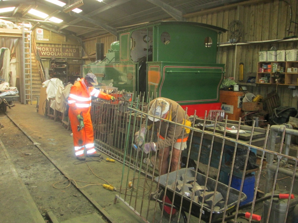 5. In the shed at Woody Bay, Martin Williams and Mike Corner are wire-brushing a section of railing.