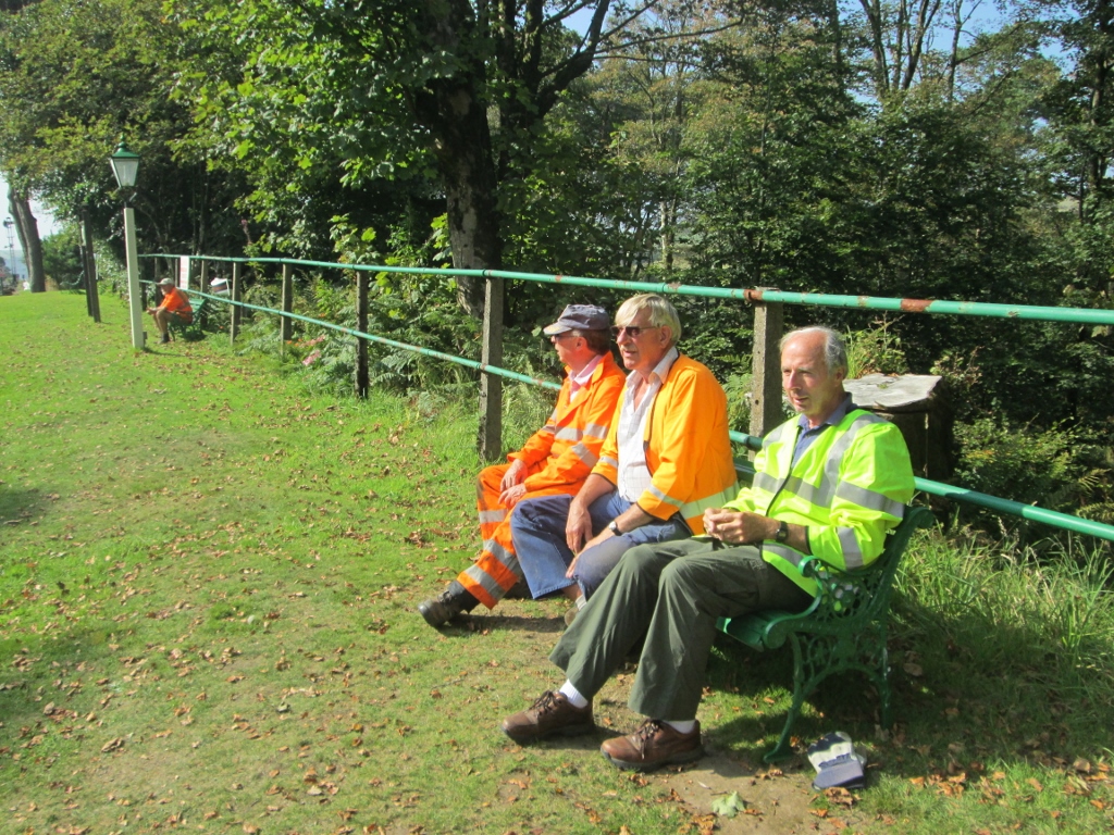 7. Relaxing at Woody Bay in the afternoon sunshine on one platform seat are Martin, Les and Rob whilst Mike is all alone on a seat further along.