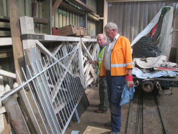 6. Rob Shortman and Les Squance paint primer onto the panel that was cleaned last week. The restored former Pilton crossing gates are in the background.