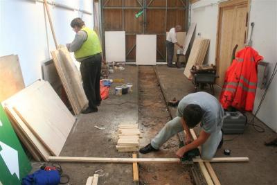 2. Hard at work: Phil sands down the edges, Nick cuts the batons to length and Peter paints wood primer on the boards.