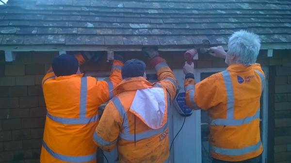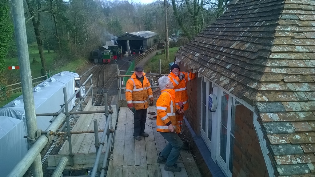 4. At last the weather was good enough for some work up on the scaffolding. Jim Pounds, Jim McFarlane and Mike Corner continue to remove flaking paint from the woodwork around the higher roof section.